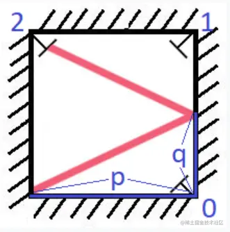 | 有一个特殊的正方形房间,每面墙上都有一面镜子。除西南角以外,每个角落都放有一个接受器,编号为 0,1,以及 2。正方形房间的墙壁长度为 p,一束激光从西南角射出,首先会与东墙相遇,入射点到接收器 0 的距离为 q 。返回光线最先遇到的接收器的编号(保证光线最终会遇到一个接收器)。 |