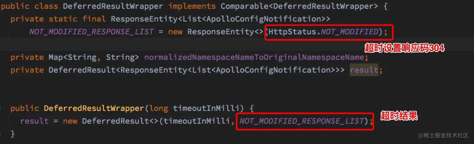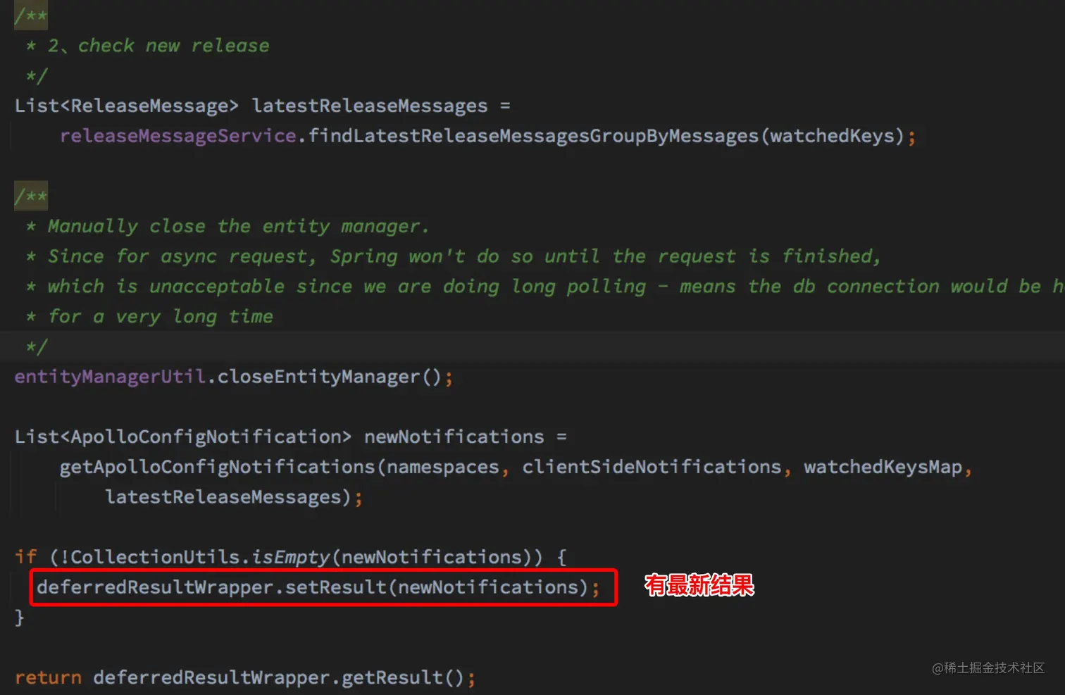 服务器端发现有最新结果,就设置结果,此时服务器端会将结果响应给客户端;没有结果请求就被挂起,在60s内服务器端通过handleMessage设置了结果,客户端就可以拿到正常响应结果,然后向服务器端发起拉取最新配置请求;在60s内服务器端没有设置结果,客户端会拿到304响应结果,此结果表示服务器端没有最新的配置,客户端不需要向服务器端发起拉取配置请求。