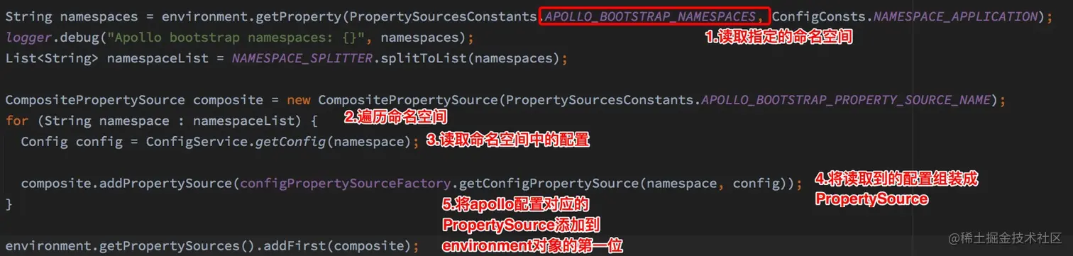 Environment对象中维护了一个private final List<PropertySource<?>> propertySourceList = new CopyOnWriteArrayList<>();列表,读取配置的时候会遍历列表从前往后进行读取,读取到结果直接返回。这也就可以说明apollo上和本地文件中有相同的配置时,读取的时候会读取apollo上的配置而不读取本地配置的原因。