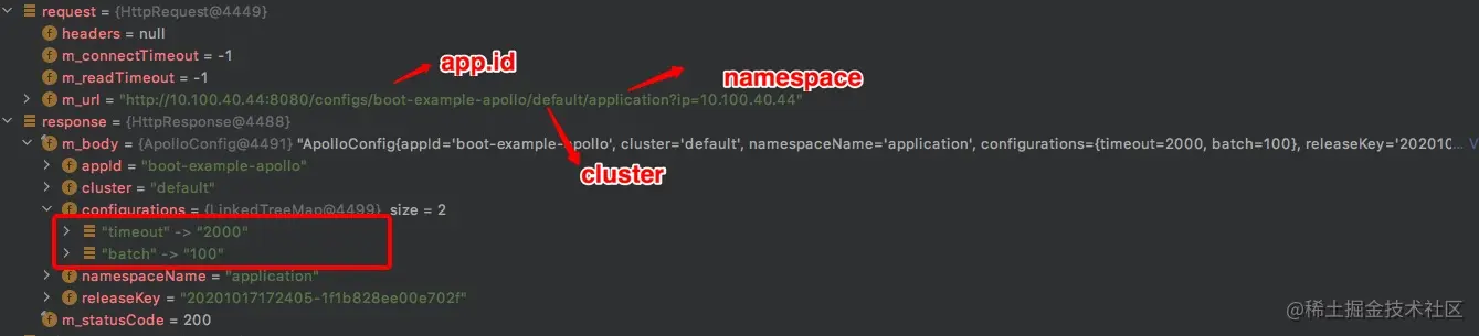 配置读取其实就是客户端向服务器端拉取配置的一个过程,客户端告诉服务器端自己需要哪个应用(app.id) + 哪个集群(default) + 哪个命名空间(namespace)下的配置,服务器端从表中读取满足条件的配置,然后返回给客户端,客户端缓存在内存中,方便后续频繁读取。