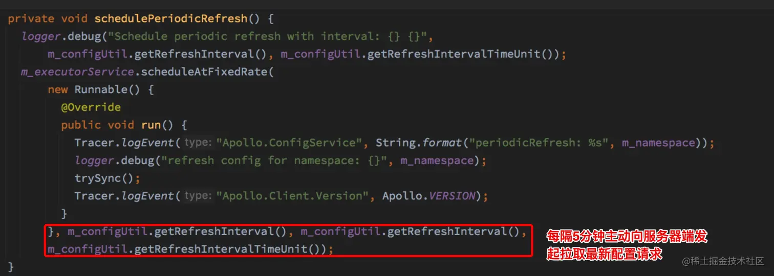 apollo除了依靠长连接通知客户端拉取配置外,还会周期性每隔5分钟主动向服务器端发送拉取最新配置的请求,从而保证推送不可用的情况下,可以通过主动拉取的方式来获取最新配置数据。