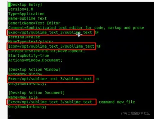 下载linux repos 文件 // 解压缩 tar -xvvf sublime_text_3_build_3176_x64.tar.bz // 移动到/opt路径下 mv sublime_text_3 /opt/ // 拷贝快速启动文件到系统菜单目录 cp /opt/sublime_text_3/sublime_text.desktop /usr/share/aplications // 按照下图修改快速启动文件中的配置 vim /usr/share/applications/sublime_text.desktop // 通过菜单 applications->progr amming->Sublime Text 打开软件
