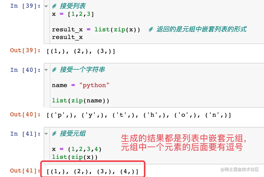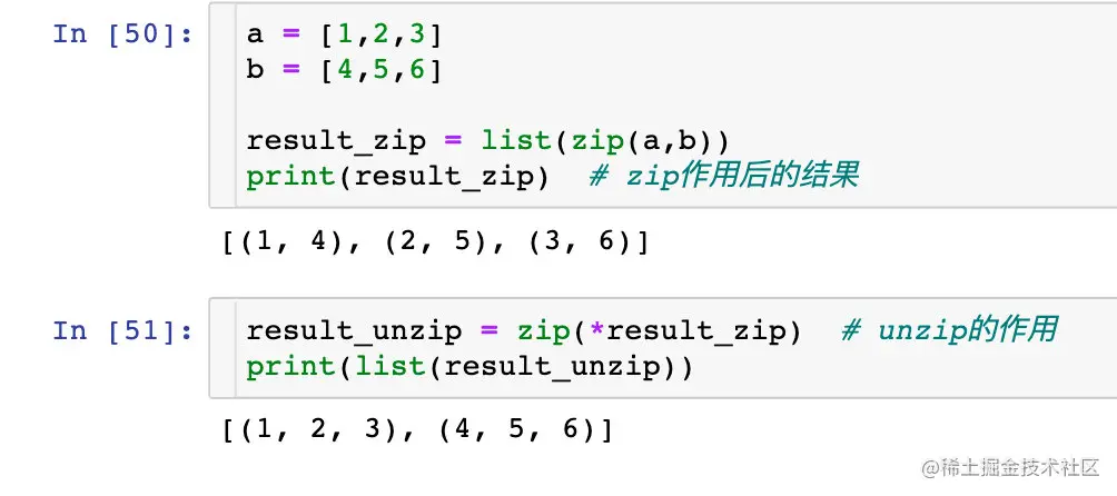 - 函数执行的结果在Python3中返回的是一个zip对象,如果需要展示成列表的形式,直接使用list方法展开;展开的结果是列表中嵌套元组的形式