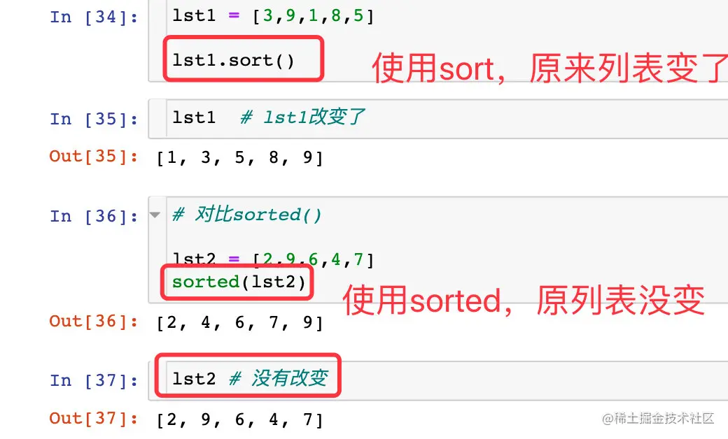 结果是将原来的列表直接原地修改,而sorted 是生成新的列表,二者是不同的