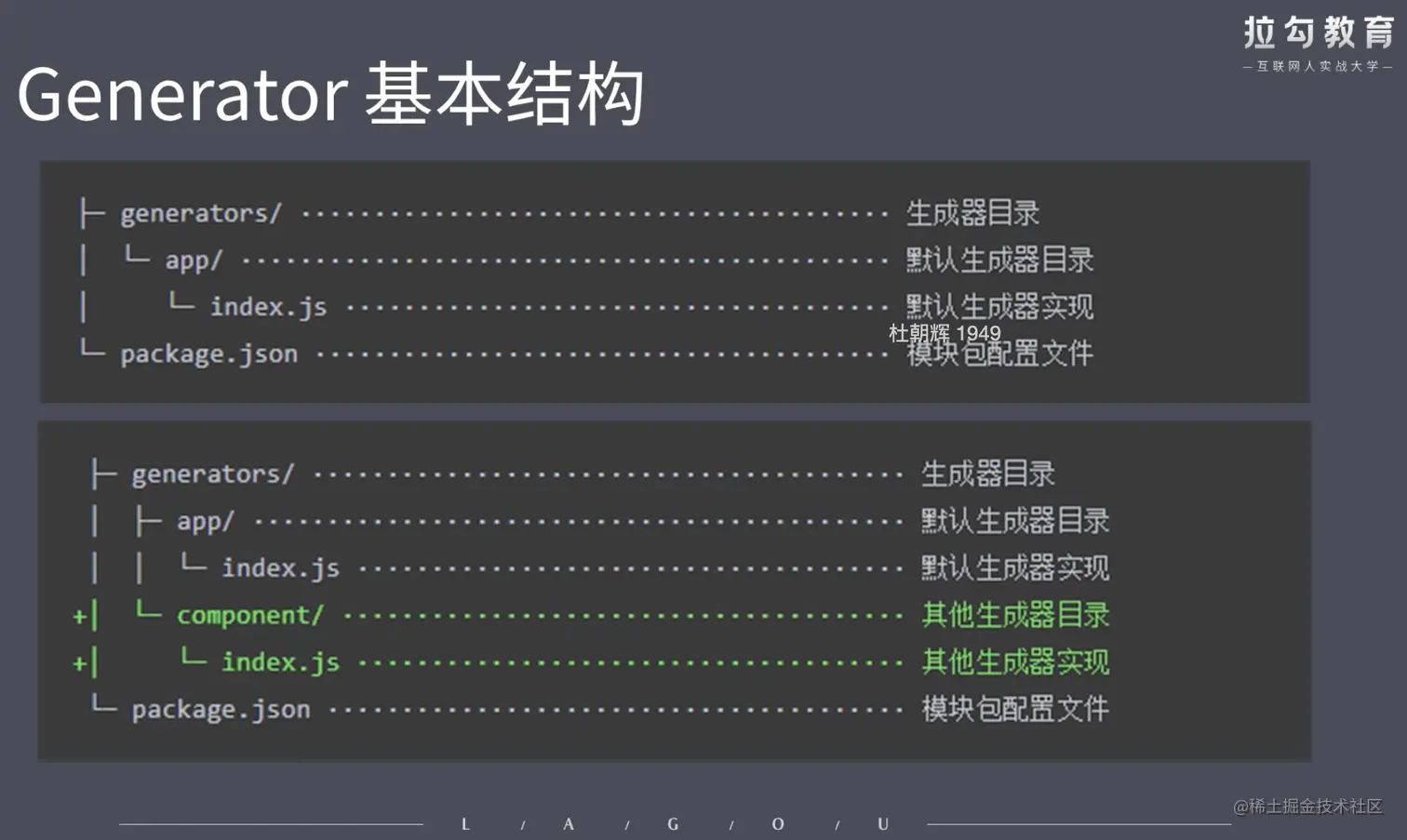 Generator本质上就是一个NPM模块,Generator有一个特定的结构,它需要在根目录下有一个Generators的文件夹然后在这个文件夹下面再去存放一个app的文件夹。用于去存放我们生成器对应的代码,如果需要提供多个的Sub Generator可以在app的同级目录再去添加一个新的生成器目录。除了特定结构还有一个和普通npm模块不同的是,Yeoman的Generator它的模块名称必须是generator-<name>的这种格式。项目初始化之后通过 yarn add yeoman-generator安装 yeoman-generator ,这个模块它提供了生成器的基类。在这个基类当中提供了一些工具函数,在创建生成器的时候更加便捷。