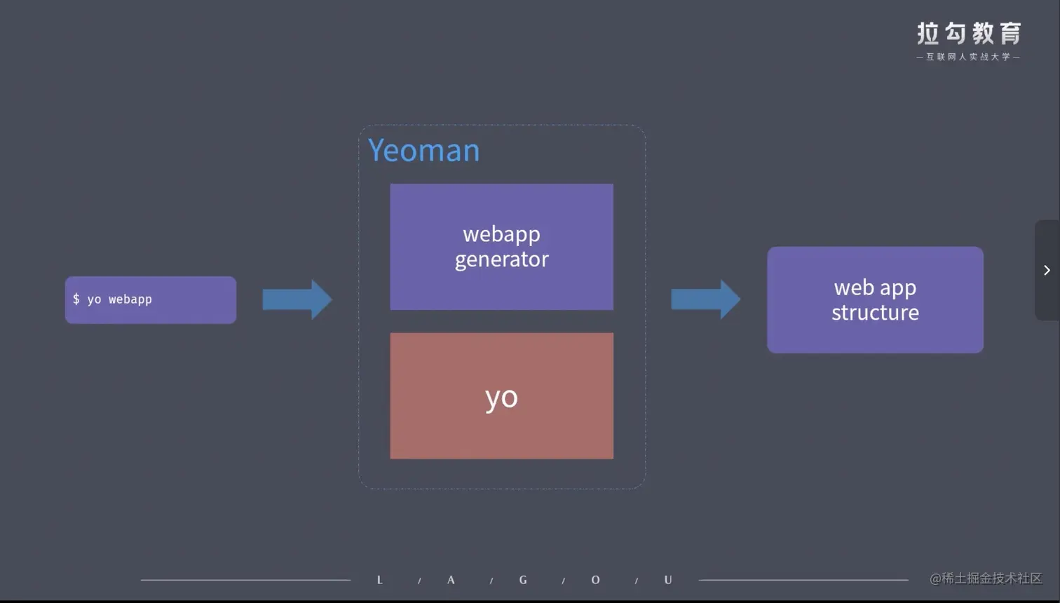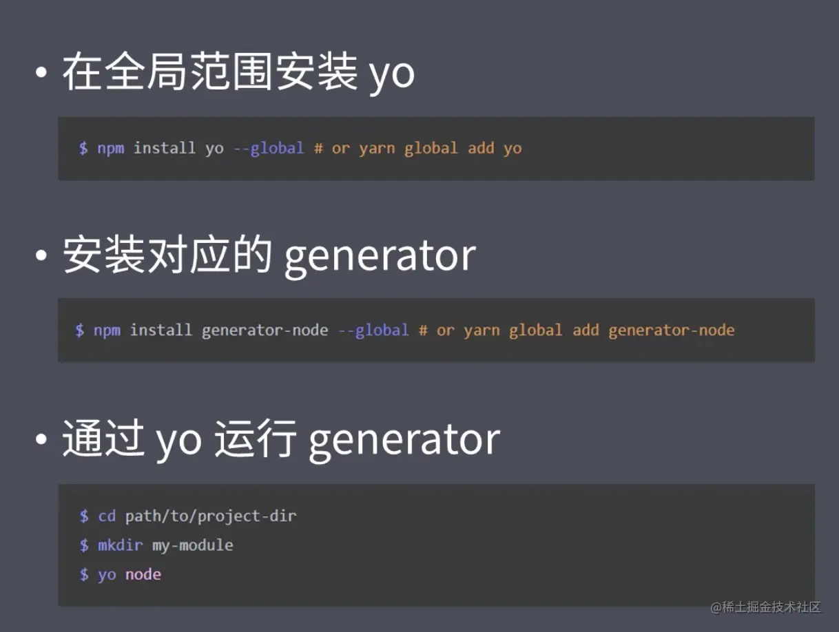 Yeoman是一款基于node开发的工具模块,使用Yeoman的第一步就是通过npm在全局范围去安装它。yarn global add yo Yeoman 通过搭配特定的Generator 才能使用,使用Yeoman创建工具必须要找到对应项目的类型的Generator。Generator 也是通过npm来安装 yarn add global add generator-node