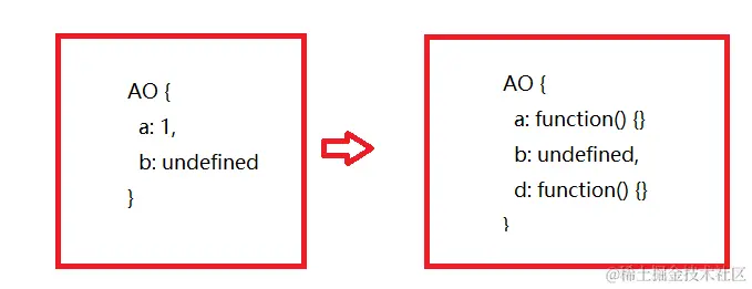 找到一个新参的声明a,又找到一个var a ,一样的名字就写一个,还找到函数表达式的声明var b ,此时的AO对象