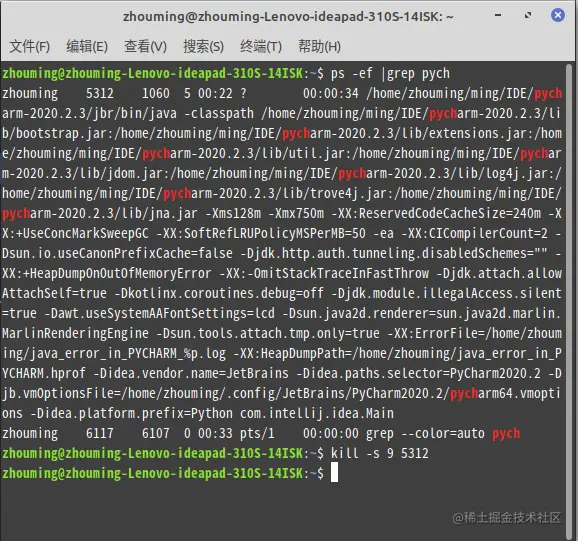 通过ps -ef|grep pych找到这个进程的pid,再强制关掉:kill