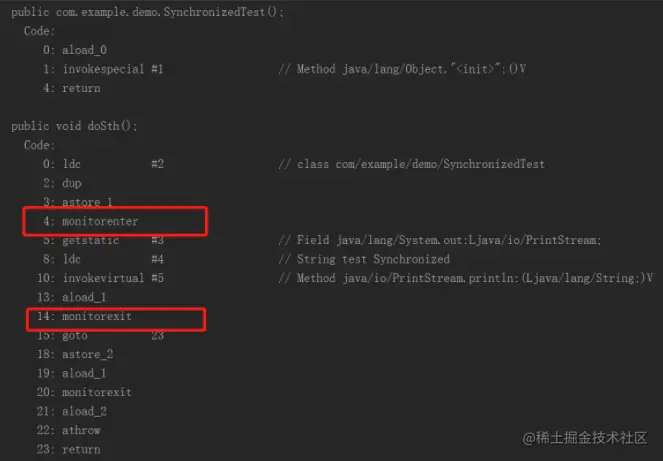 - 同步代码块是通过monitorenter和monitorexit来实现,当线程执行到monitorenter的时候要先获得monitor锁,才能执行后面的方法。当线程执行到monitorexit的时候则要释放锁。