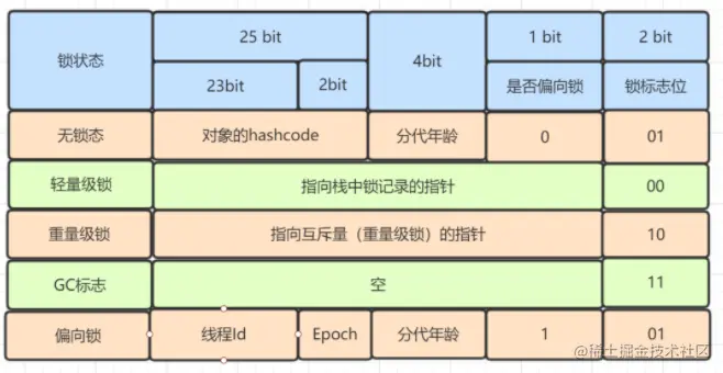 在32位的HotSpot虚拟机中,如果对象处于未被锁定的状态下,那么Mark Word的32bit空间里的25位用于存储对象哈希码,4bit用于存储对象分代年龄,2bit用于存储锁标志位,1bit固定为0,表示非偏向锁。其他状态如下图所示: