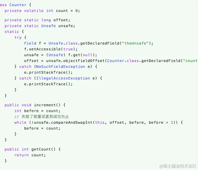 在increment()方法中,我们通过调用Unsafe的compareAndSwapInt()方法来尝试更新之前获取到的count的值,如果它没有被其它线程更新过,则更新成功,否则不断重试直到成功为止。