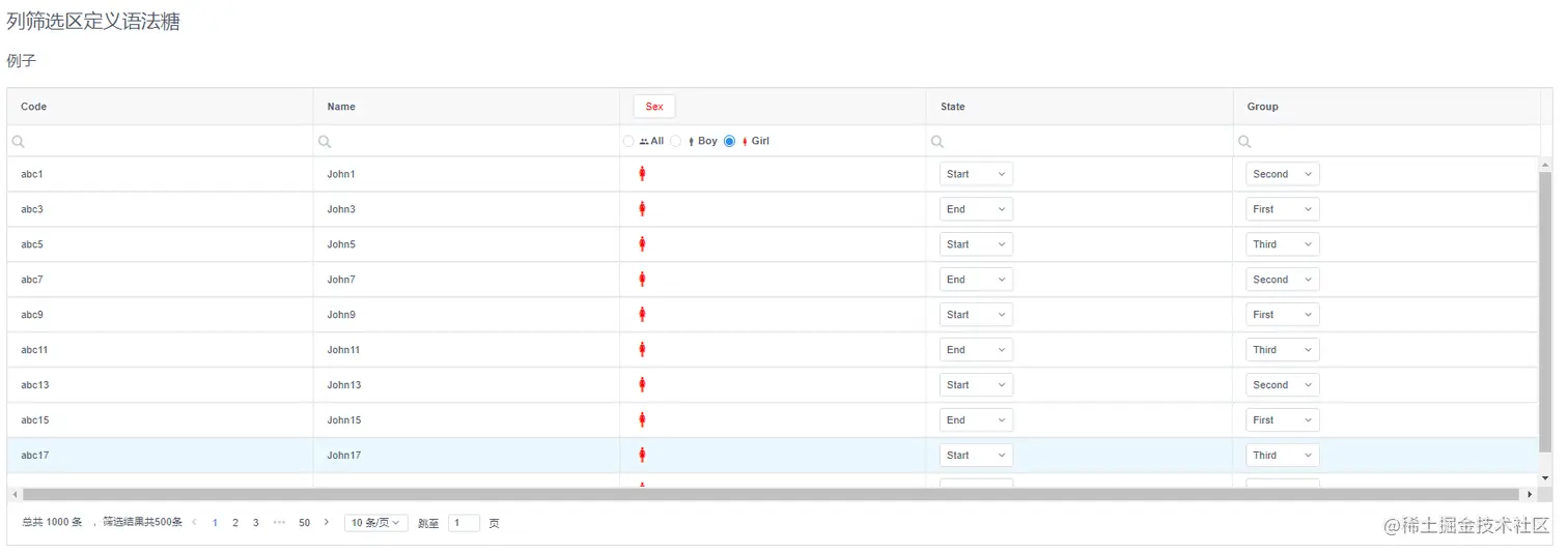 - BeeColumnHeader 可以自定义表头,比如此处的sex字段的表头渲染成了Button按钮