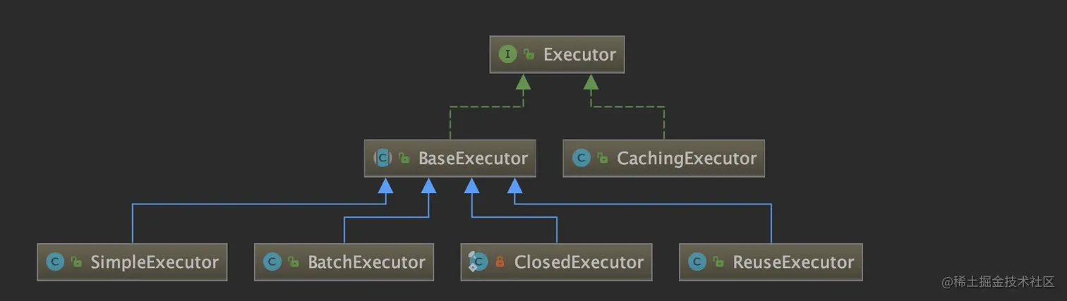 executor的继承关系如下所示,正常情况下使用的是cachingExecutor,这里使用装饰器模式,cachingExecutor会把调用委托给baseExecutor实现类执行,在baseExecutor实现类外面包一层缓存。