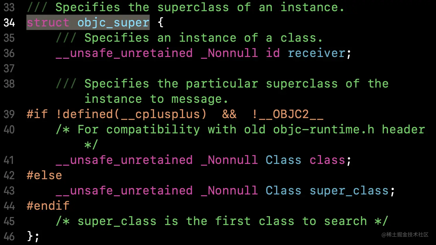 我们看到objc_super是个结构体类型,receiver是消息接受者,而super_class只是一个类型,我们再看[super class]在C++的代码,objc_msgSendSuper传入的第一个参数为(id)self,所以这个消息的接收者就是self,就是LGTeacher。补充:objc_super的class和super_calss是为了快速查找(是去类对象class中查找还是直接去super_class中查找)