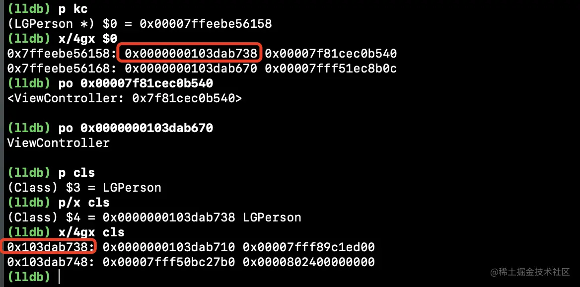 kc是LGPerson类的对象,他的isa指针指向了cls,这个时候就好理解了吧!kc调用saySomething,跟对象调用一样,通过isa指针找到类,在类中找到方法调用,self.lg_name是首地址进行偏移8字节的到的值,我们偏移8字节就是0x0000000103dab670,我们进行打印,发现就是ViewController。我们发现kc虽然是LGPerson对象,但是内存里存的和我们常看到LGPerson对象不同。这是什么情况呢?