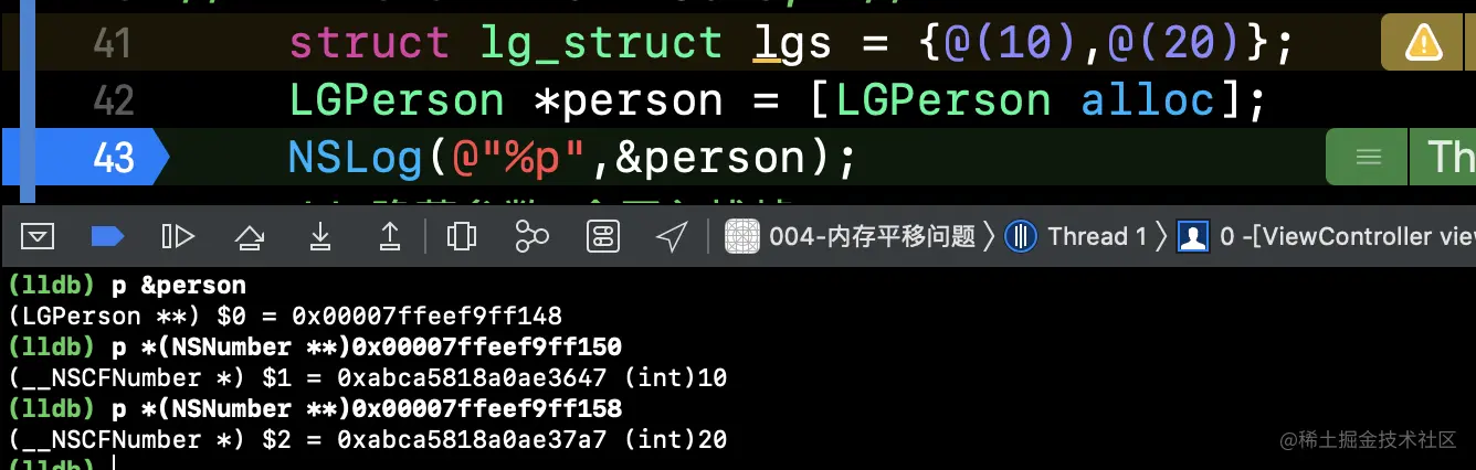 我们创建一个结构体kc_struct,然后在viewDidLoad进行初始化,我们在NSLog上打断点,看下入栈的顺序,运行代码在断点进行打印: