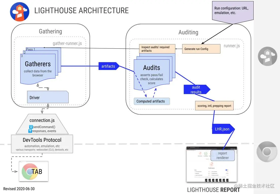 先看下 Chrome Lighthouse 的架构图(图来源于 Lighthouse Git),主要基于 4 个主要步骤实现,分别是交互驱动,收集,审计以及记录组成,参考了 Chrome Lighthouse,百策的检测模型逻辑也主要由这 4 步组成: