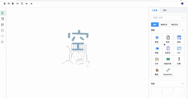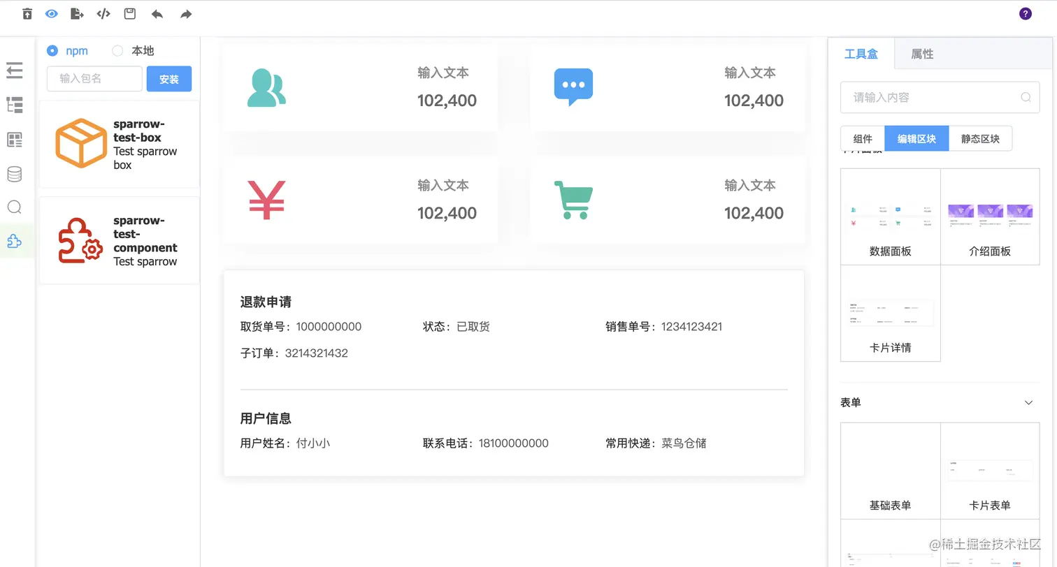 sparrow-js 提供丰富的物料来帮助开发者提效,目前生成的源代码是vue,element-ui的代码,提供函数级别代码搭建能力,可以注入逻辑代码。界面展示如下图: