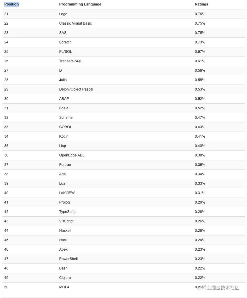TIOBE 每个月都会公布一次编程语言的排行榜,这份排行榜排名基于全球技术工程师、课程和第三方供应商的数量,其中包括了流行的搜索引擎以及技术社区,如 Google、百度、维基百科等等。