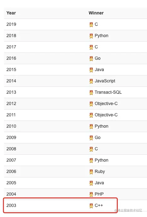C++ 曾在 2003 年获得年度编程语言的称号,排行榜中比例高达 17.53%,达到历史最高峰。但在此之后,C++ 比例开始下降,在 2017 年,它的历史达到最低值为 4.55%。目前比例有所回升,与去年这个月相比,C++ 现在是增长最快的语言(+ 1.48%),可能是因为 C ++ 20 标准的到来,引入了很多新特性,备受关注。