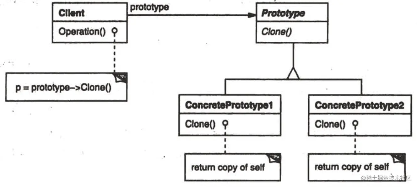 Client 是发出指令的客户端,Prototype 是一个接口,描述了一个对象如何克隆自身,比如必须拥有 clone() 方法,而 ConcretePrototype 就是克隆具体的实现,不同对象有不同的实现来拷贝自身。