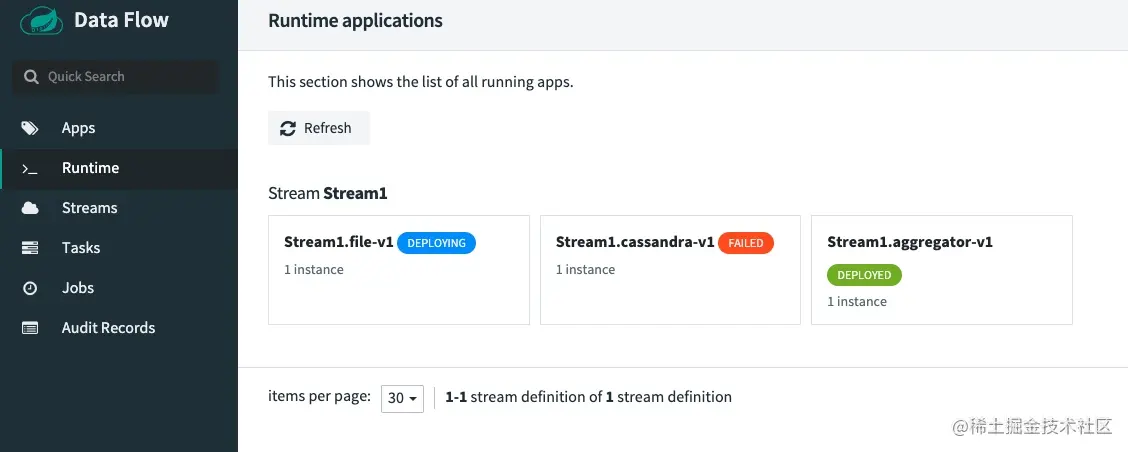 Stream 创建成功后,需要通过skipper-server发布至Runtime,基于消息队列进行驱动并执行数据处理