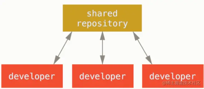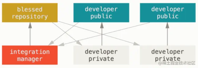 这个开发流程大致是每个开发人员都有一个自己的公共仓库,平时自己在本地开发,然后把 commit push 到自己的公共仓库上去。等一个模块或者项目开发完成后,会通知整个项目的管理员,让其把自己开发的模块从自己的公共仓库 clone 下来,然后 push 到一个整合的代码仓库(最终的代码仓库)。