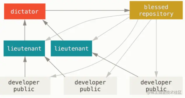 这个有点类似 master-slave (主从模式)的感觉。这种工作流主要用在比较复杂的系统中,比如说 Linux 的内核。每个副官(lieutenant)负责一个部分,司令官(dictator)负责整合每个副官的改变,然后开发者根据所开发的部分,将代码上传到对应的副官仓库上。
