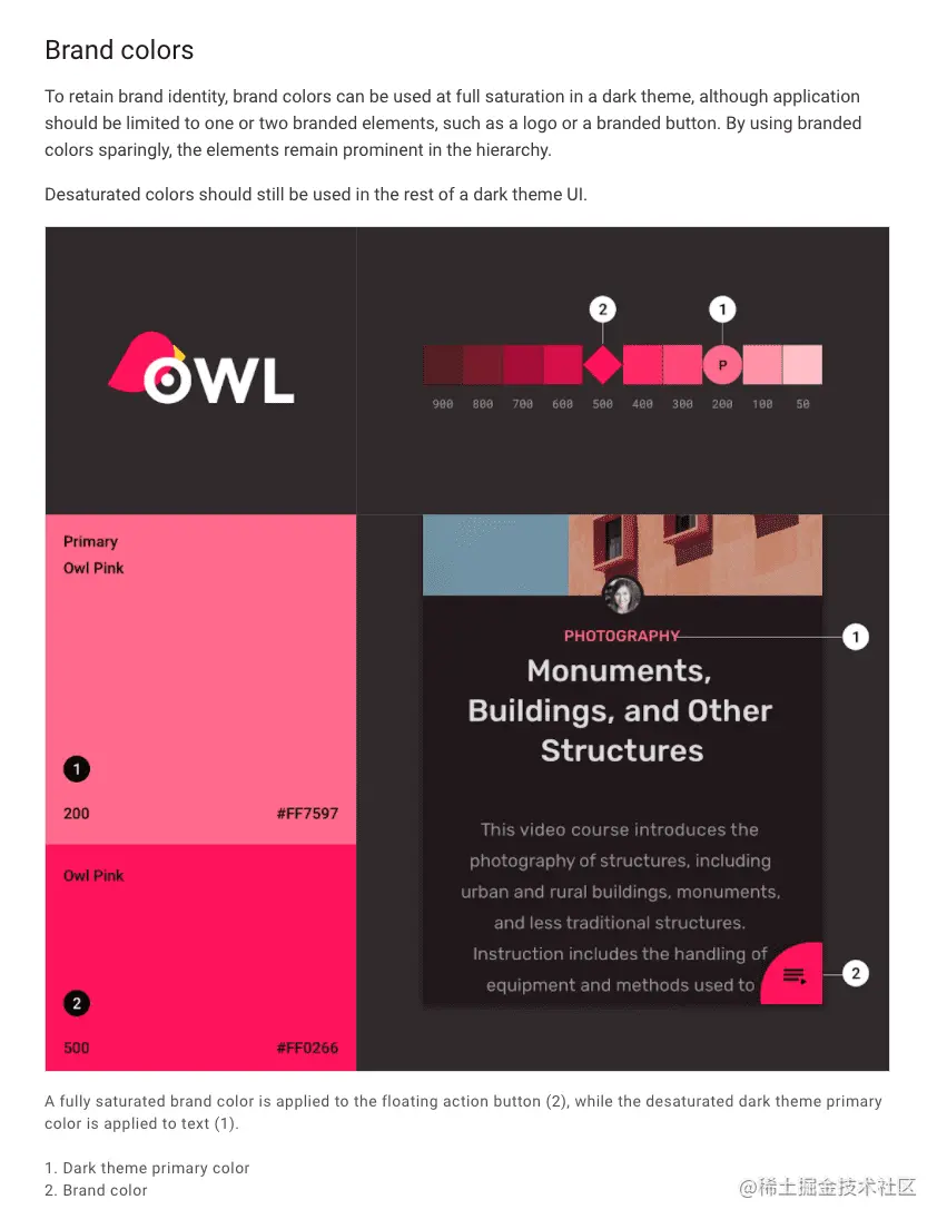 @colors 的变化也会鼓励您创造更多颜色。如果在不同的情境下要使用具有相同值的、新的语义化命名的颜色 (即,不是背景色但应该使用相同颜色),这时候您仍需要在 colors 文件中创建新的条目。通过使用主题背景属性,我们可以将语义颜色的声明从提供它们的值中区分开来,而且让使用方更清楚地了解到颜色会随主题背景而变化 (因为它们使用 ?attr/ 语法)。将颜色声明保持为字面值,您就可以自定义应用使用的颜色调色板,并在主题背景级别修改它们,这会让 color.xml 较小且易维护。