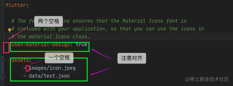 如果我们要使用其中的 test.png ,就必须在 pubspec.yaml 的 assets 部分中显示声明: