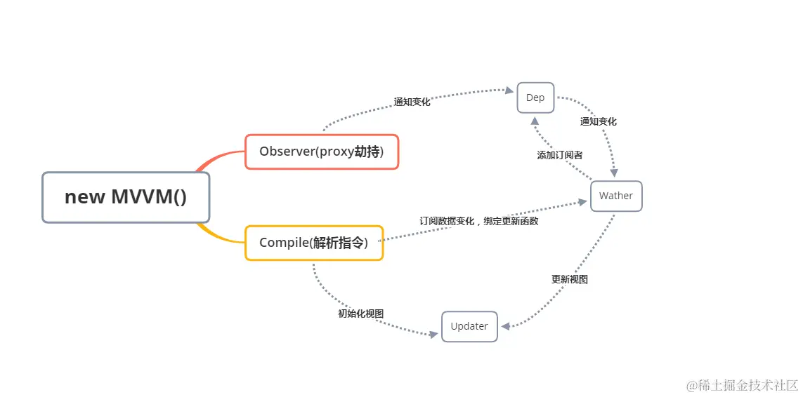 - 3、实现一个Watcher,作为连接Observer和Compile的桥梁,能够订阅并收到每个属性变动的通知,执行指令绑定的相应回调函数,从而更新视图