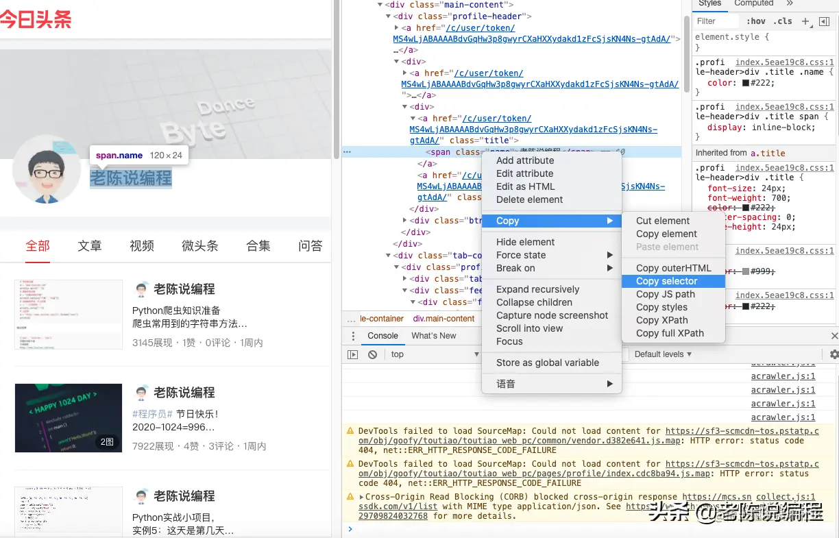 在页面中,按下键盘F2键,可显示源代码。鼠标选中你要获取的节点,右键【检查】就可定位到代码中,右键代码,选择【Copy】-【Copy Selector 】或【Copy XPath】便可复制节点或路径的内容。