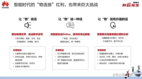 我们采集的数据量非常庞大,这些数据如何被挖掘,去产生真实的有价值的信息,对于我们来说是一个非常大的挑战。例如,现有算力是否足够支持对海量数据的挖掘,海量的数据能否被存储下来,我们能否构建实时流、时序、离线、多维的分析能力去应对。此外,不同的数据所需的分析手段和分析目标都是不同的,如何基于复杂的应用场景进行抽离?最后到商业闭环,这些数据如何进行价值变现,产生新的分配等。在物联网时代,虽然会带来大量红利,但也面临巨大的挑战。华为云的物联网解决方案就是要面对这些挑战,解决问题。
