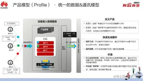 Profile是通讯模型的一个映射,即如何将不同类型的数据映射到通讯模型的实例。例如左侧是不同厂家生产的水表,它的信息表达和数据格式都不一样,通过我们产品模型里的插件,可以将不同数据转换为统一格式。对于应用厂家来说,不用去管下面的设备类型,也不用关心是A厂家还是B厂家的设备,由平台屏蔽设备差异提供统一接口,更利于进行应用开发。