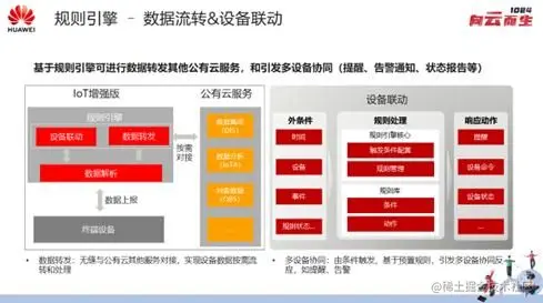 规则引擎是华为云IoT特有的能力,主要是通过规则引擎实现数据的流转和设备的联动。设备的数据产生后,通过我们的规则引擎流转到其他公有云的服务,数据分析服务,对象存储服务等,还有客户自己的应用,如此可使得数据产生价值。设备联动,也是基于规则引擎来实现的,其目的就是实现设备的条件、动作、数据上报等,触发另外一个设备的其他事件。比如说上文路灯的场景,通过光敏的传感器检测到外界的光照强度大于某个值的时候,此时路灯可以实现自动关闭,这整个流程,就是通过设备联动实现的。