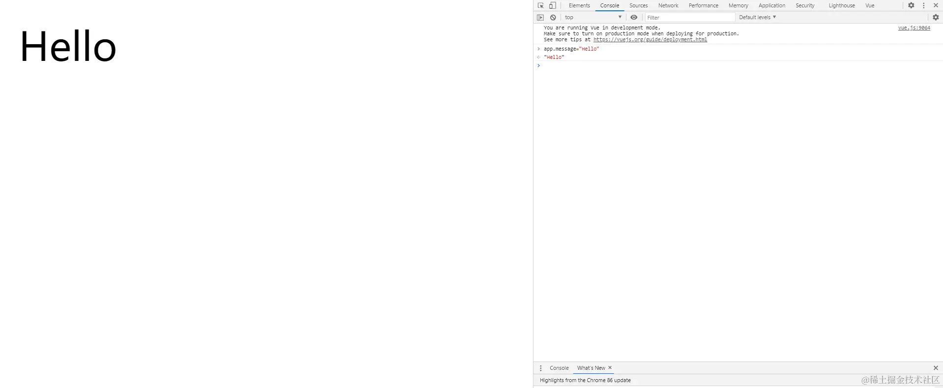 ❝Vue.js 的核心是一个允许采用尽可能简洁的模板语法来声明式地将数据渲染进 DOM 的系统,如我们之前所提到的Hello Vue.js,在我们看到的简单语法之下其实Vue为我们做了很多的工作,这时数据与视图已经双向绑定,我们可以通过改变message进而改变视图。打开控制改变messgae效果如下。
