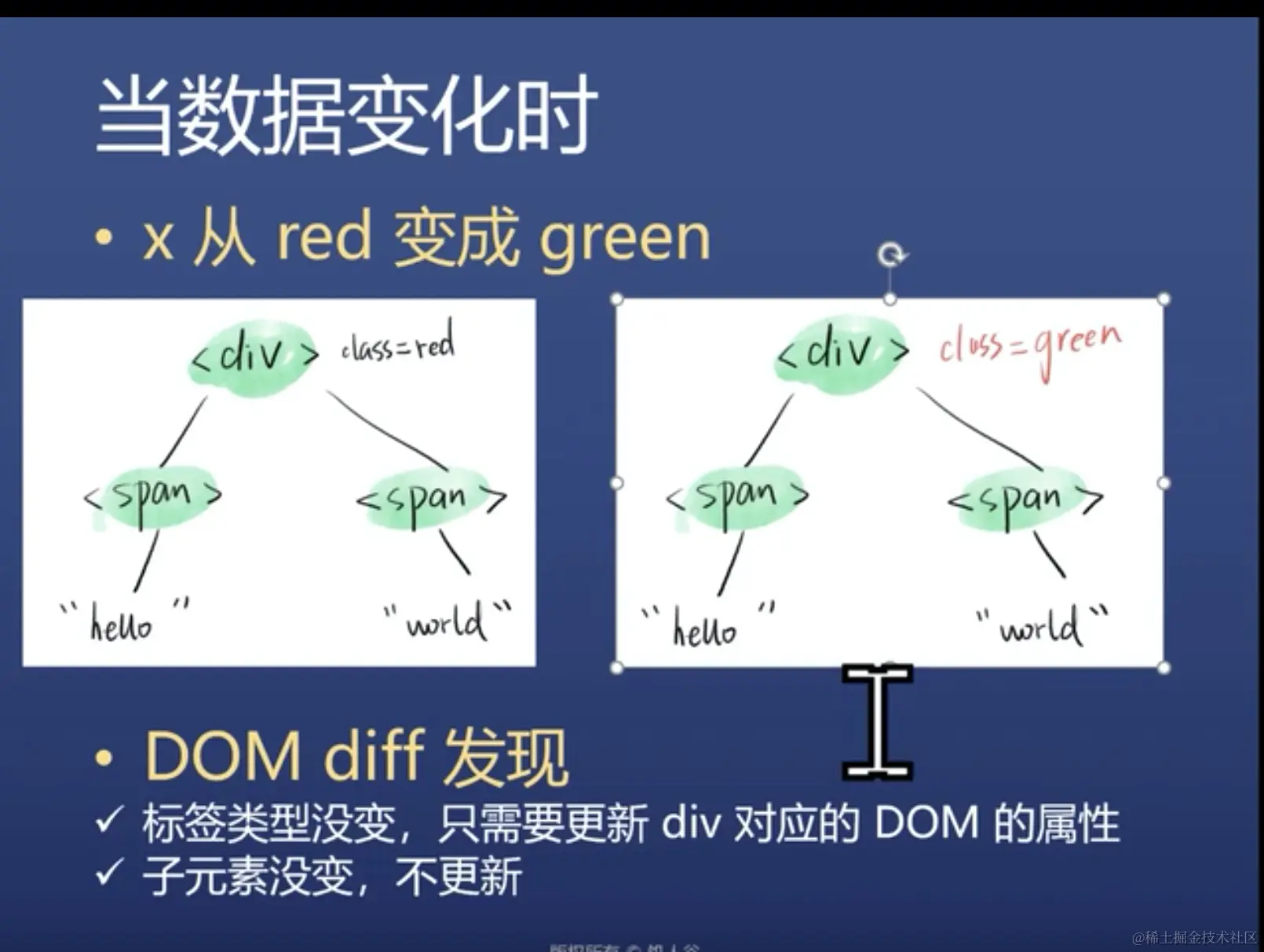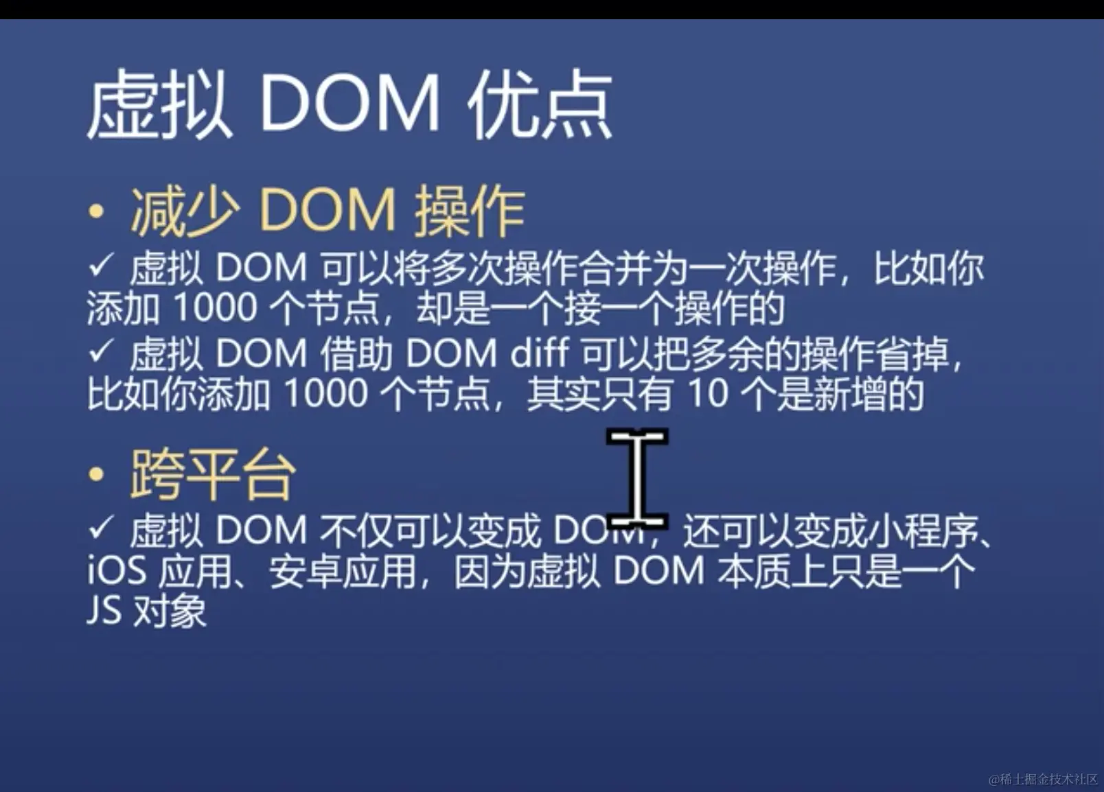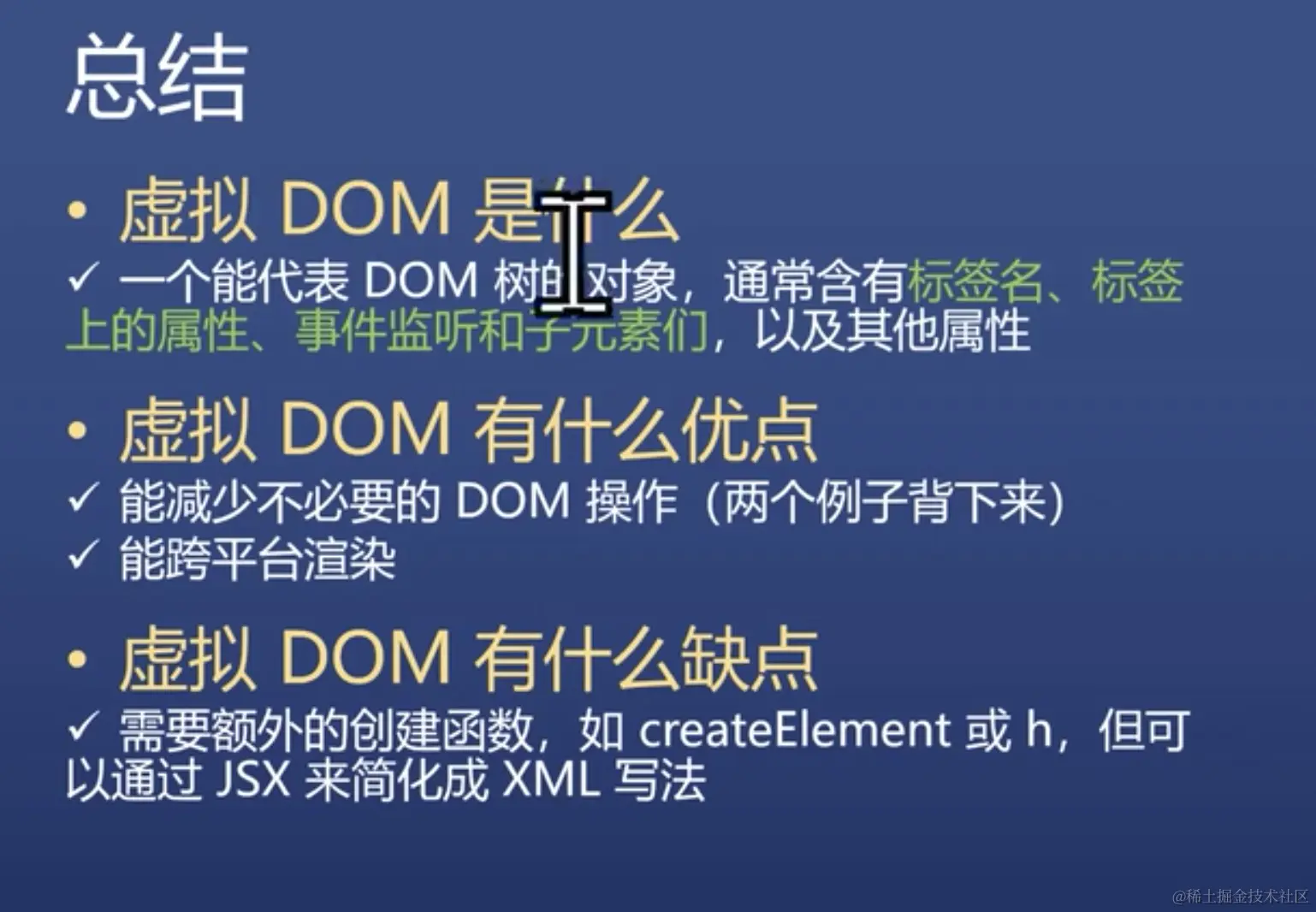 虚拟DOM与DOM Diff 的原理 南果梨 2020-10-26 243 阅读1分钟 jsx通过babel把dom转成createElement形式 如果用了jsx语法,但是也依赖打包工具,需要额外的构建过程 当操作dom少的时候虚拟dom优势更大 当操作dom多的时候 原生的速度就显现出来了,因为虚拟dom需要额外计算许多,所以更慢 diff