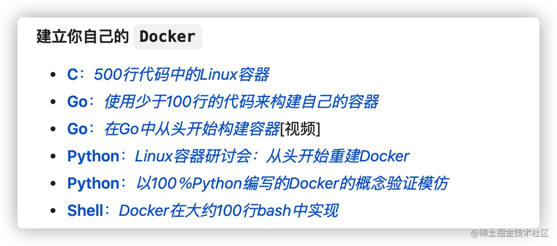 如果你思考过这些问题的话!推荐你可以看看这个仓库“创建一个你自己的 Docker”相关的内容。你可以找到使用 C 语言、Go 语言甚至是 Python 语言和 Shell 语言实现的简易版 Docker。
