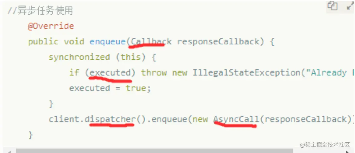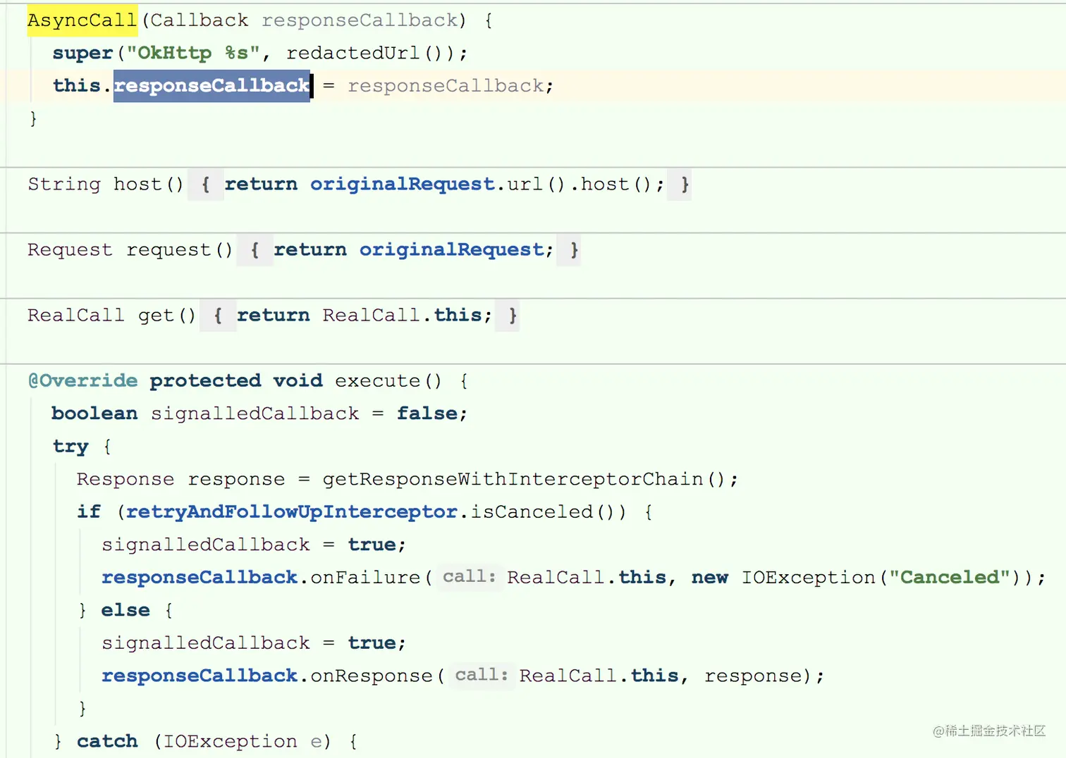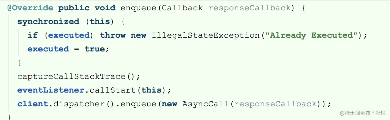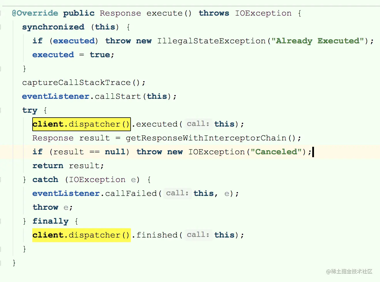 RealCall是 OKHttp 真正的请求执行者,有两个比较重要的方法: execute 同步方法 和 enqueue 异步 方法,我们来看看同步方法是怎么做的吧