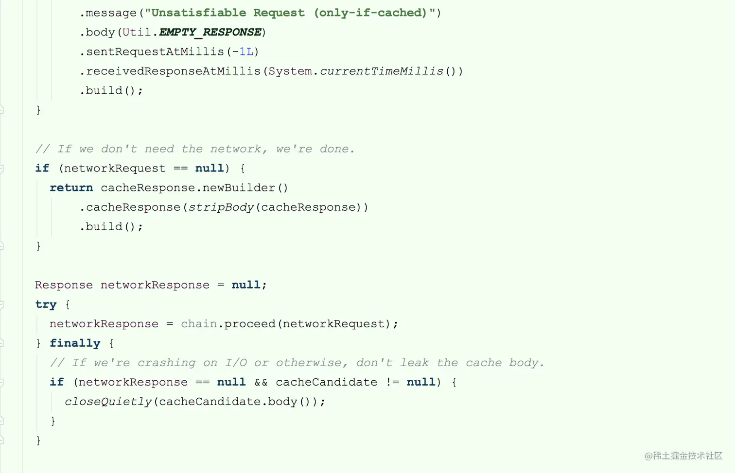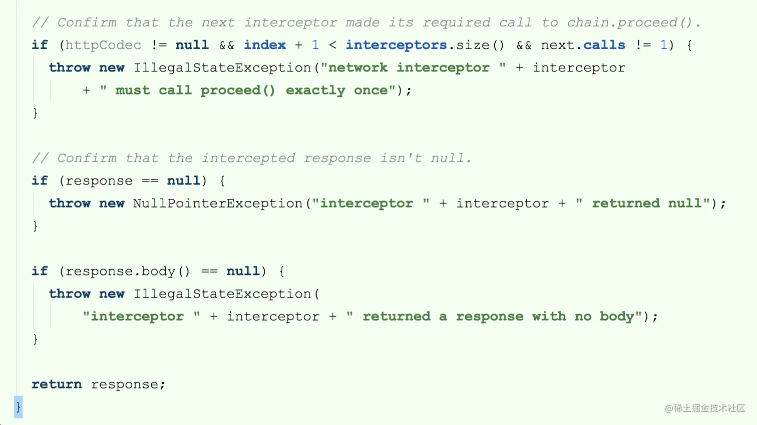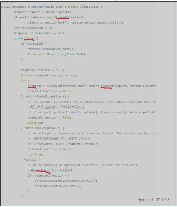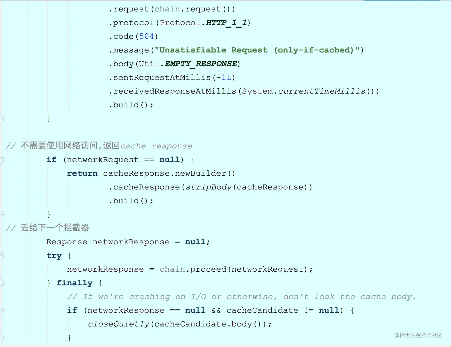// intercept()方法会在开始执行请求时调用。其中chain.proceed(request)内部是真正请求的过程,是阻塞操作,执行完后会就会得到请求结果ResponseBody