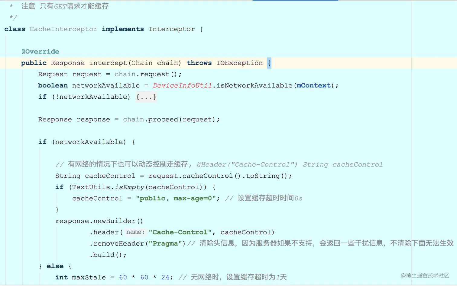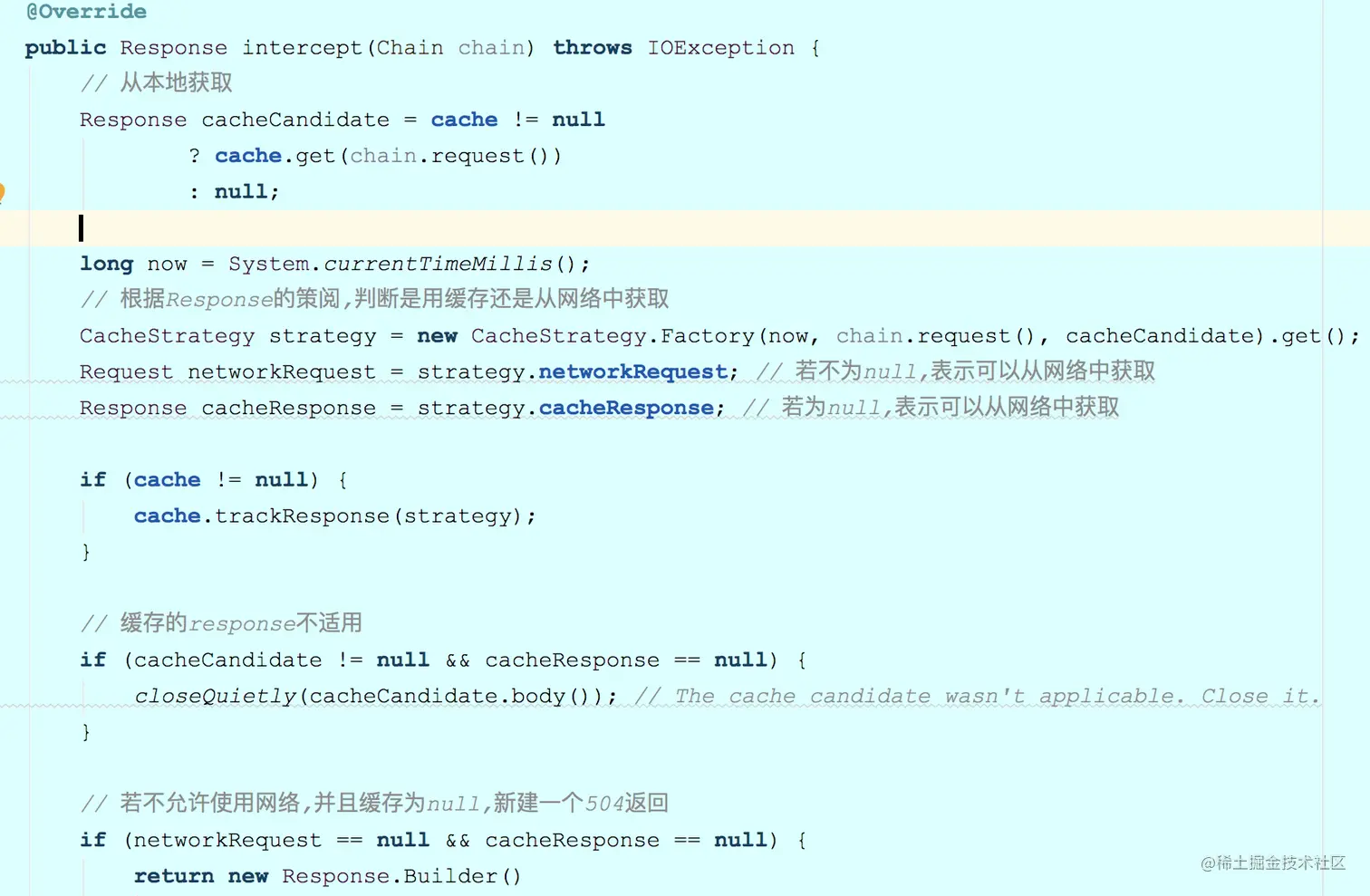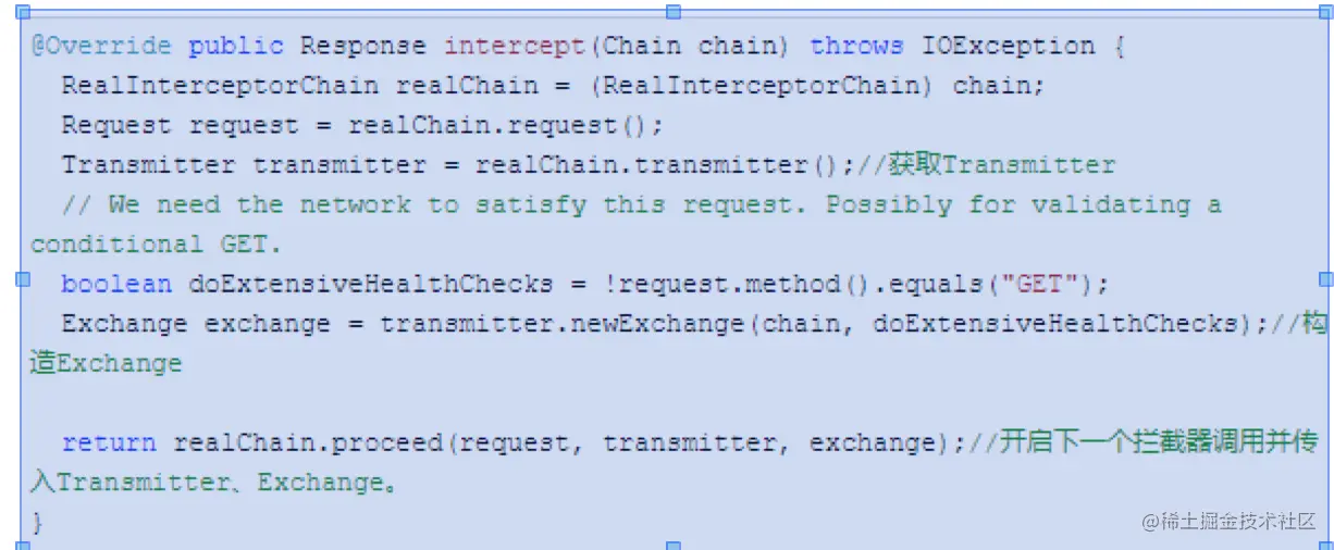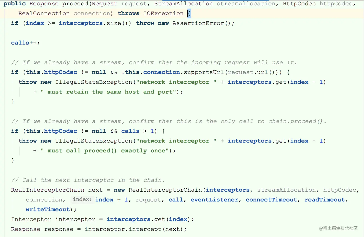 // intercept()方法会在开始执行请求时调用。其中chain.proceed(request)内部是真正请求的过程,是阻塞操作,执行完后会就会得到请求结果ResponseBody