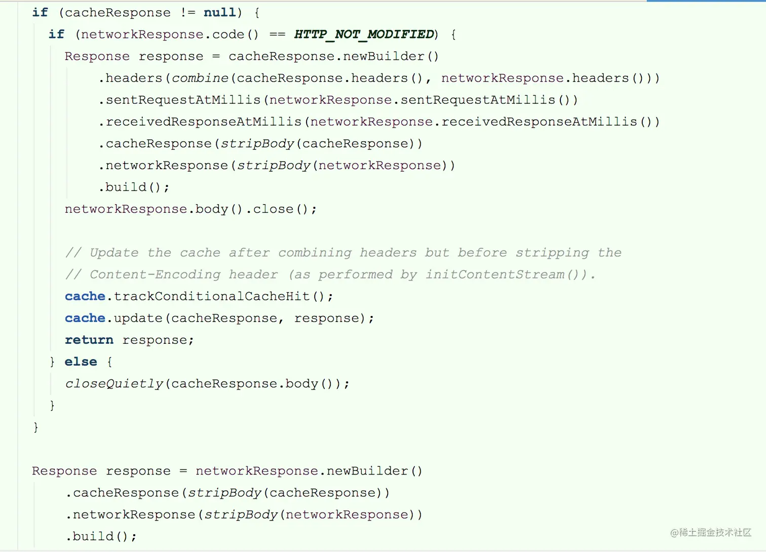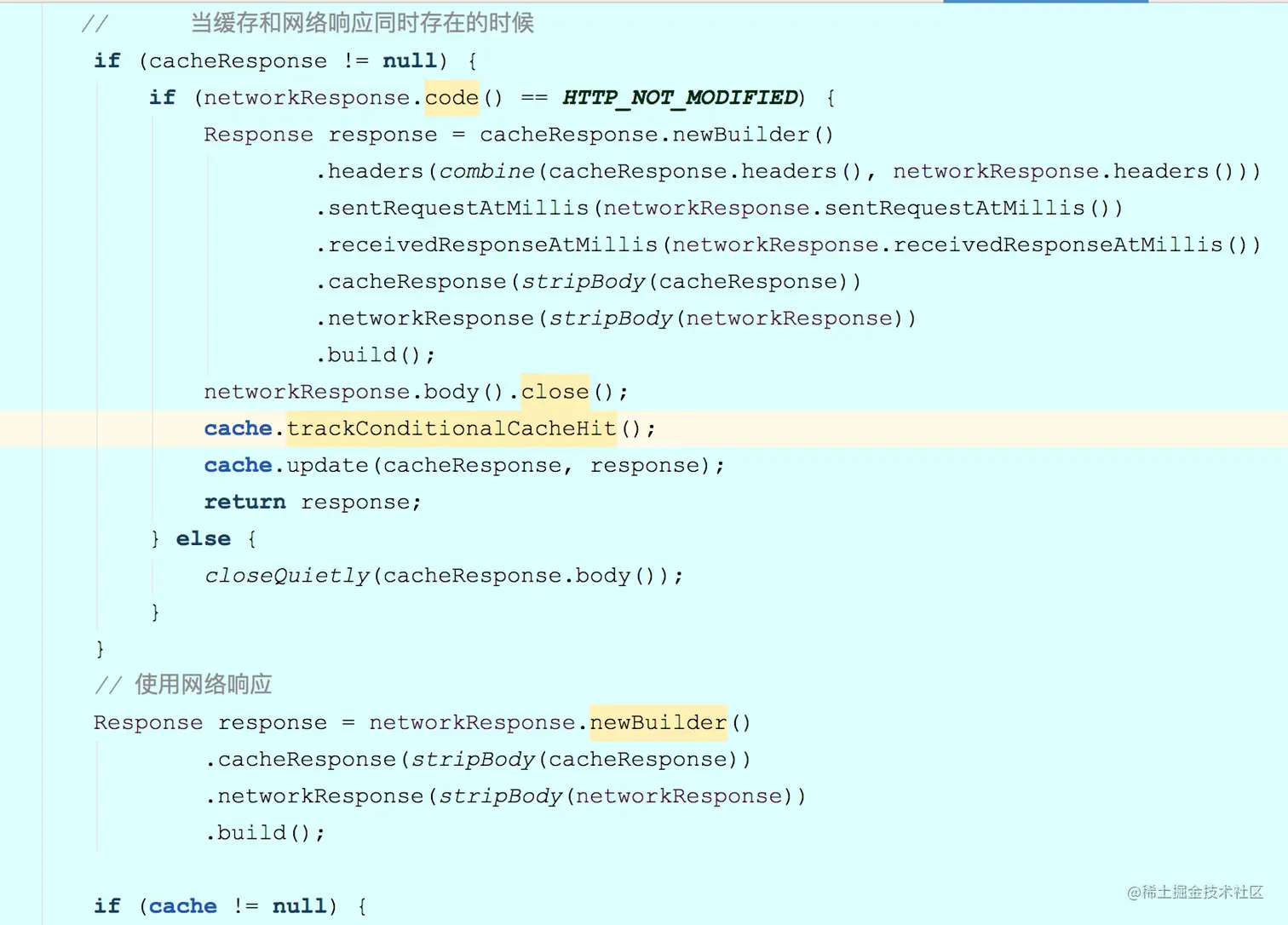 如果本地已经存在 cacheResponse ,那么让它和网络得到的 networkResponse 做比较,决定是否来更新缓存的 cacheResponse