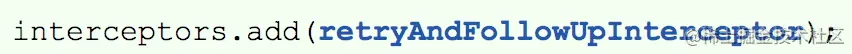 除了在client中自己设置的 interceptor ,第一个调用的就是 retryAndFollowUpInterceptor