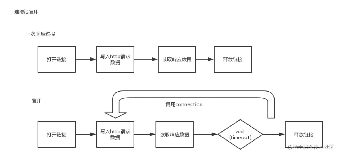 当我们打开一个新的连接,写入http请求数据的时候,读取响应数据,释放连接这个过程中,我们再释放连接我们可以复用connection写入http请求数据,这就是复用原理