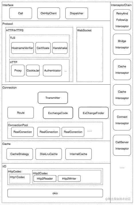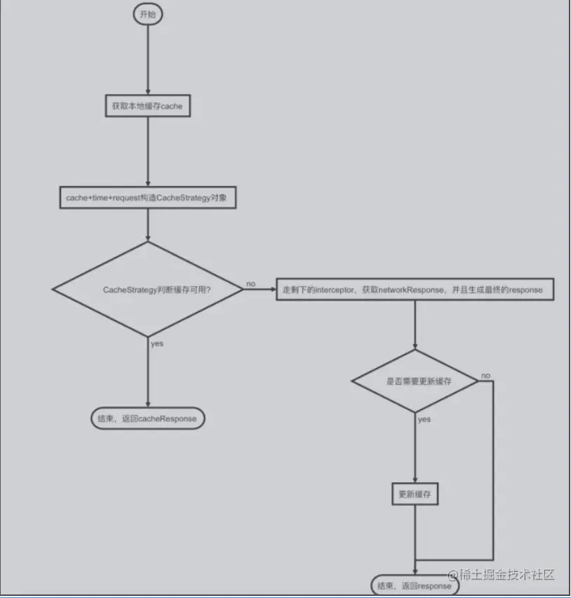 用了 责任链设计模式 ,它将请求一层一层向下传,直到有一层能够得到Resposne就停止向下传递,并 Response 向上面的拦截器传递,然后各个拦截器会对 respone 进行一些处理,最后会传到 RealCall 类中通过 execute 来得到 Response 。