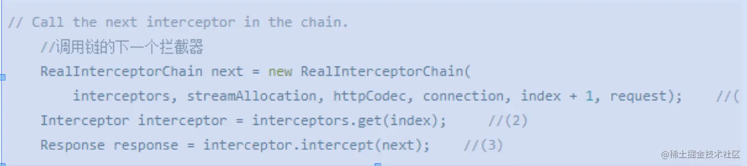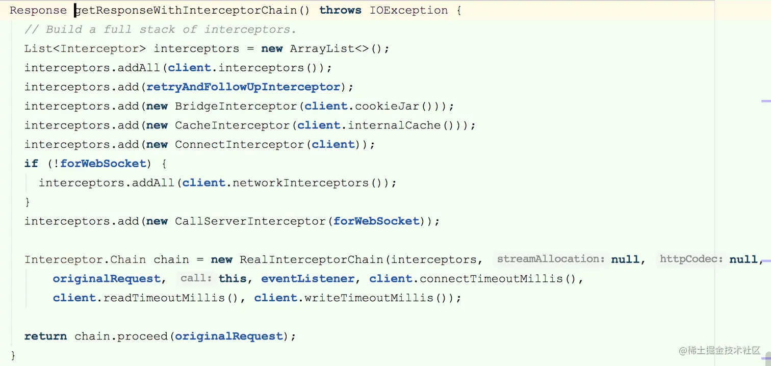 再调用 getResponseWithInterceptorChain() 函数获取 HTTP 返回结果,从函数名可以看出,这一步还会进行一系列“拦截”操作。