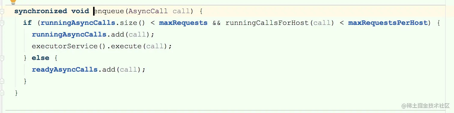 如果中的 runningAsynCalls 不满,且 call 占用的 host 小于最大数量,则将 call 加入到 runningAsyncCalls 队列中执行,同时利用线程池执行 call ;