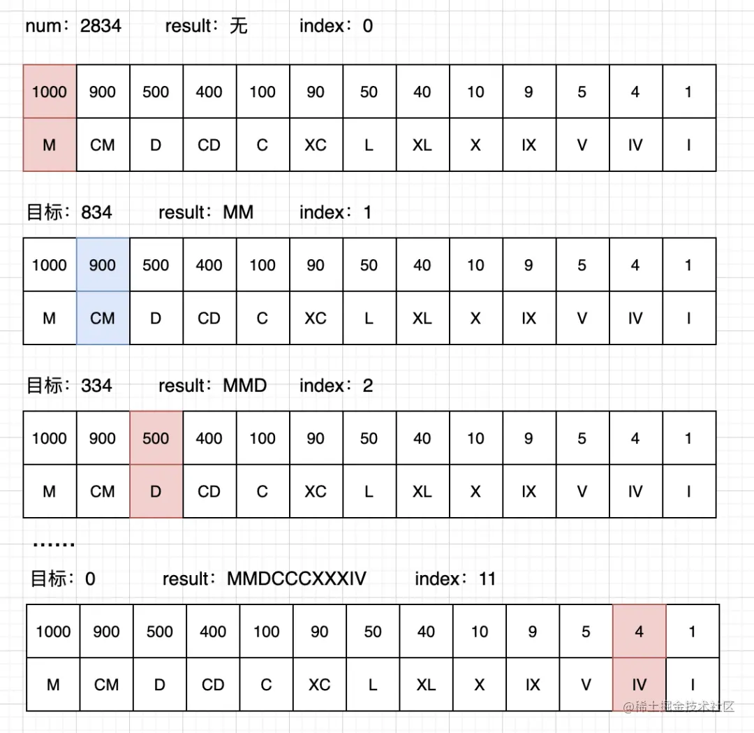然后我们利用这张表格,对给出的数字进行转化(拼凑)。假设我们要找的数为2834,大概的流程如下(其实是一种类似贪心的思想):