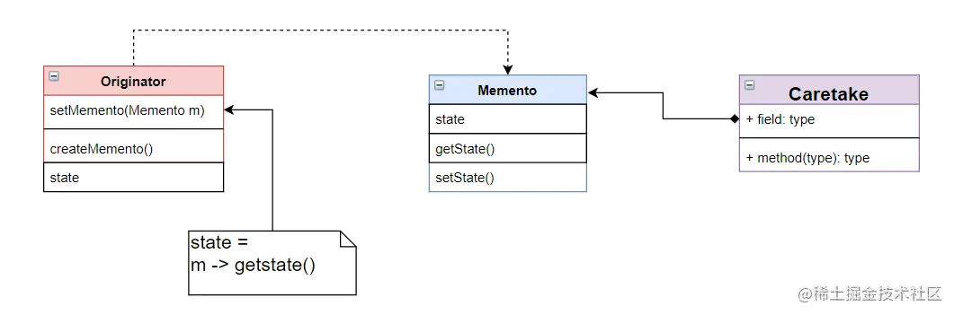 Originator用来描述一个需要被进行备忘录的对象,「它可以主动的创建一个备忘录,并且设置其状态」Memento备忘录对象,用来保存Originator对象的状态,提供两个接口用于读取和设置对象的状态Caretake。执行具体的备忘录调用。「对于它而言备忘录仅仅可以查看,但不能修改」