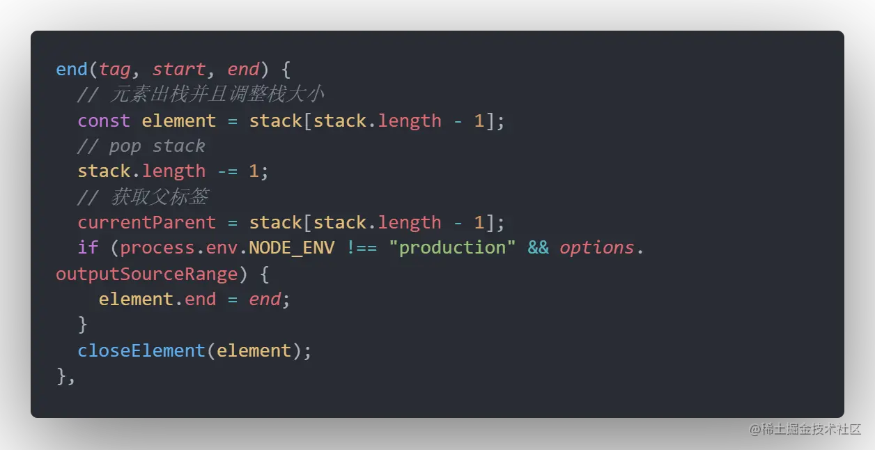 注:closeElement函数将单独提出来讲;这里的stack非parseHTML函数内部的stack